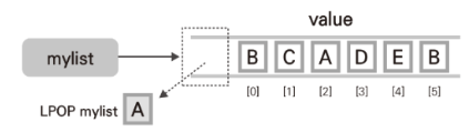 LPOP mylist # mylist의 왼쪽에서 첫 번째 요소를 제거하고 반환한다